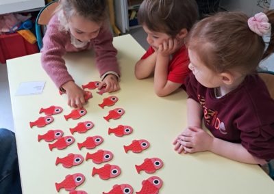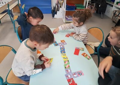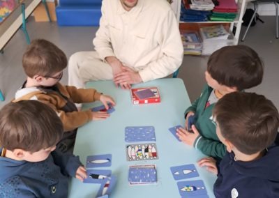 Les jeux ont été répartis par niveau. Les enfants par groupe de 4 à 5 joueurs, encadrés par un adulte, ont pu prendre part à de parties de 10 à 15 min. Pour cela, Delphine, l’enseignante, a sélectionné des jeux d’observation, de coopération, d’association, d’équilibre, de stratégie, des jeux de plateaux et des jeux de cartes, permettant de développer le langage oral, la logique mathématique, la motricité fine, mais aussi de sensibiliser les enfants au respect des règles de jeu, et des autres joueurs.